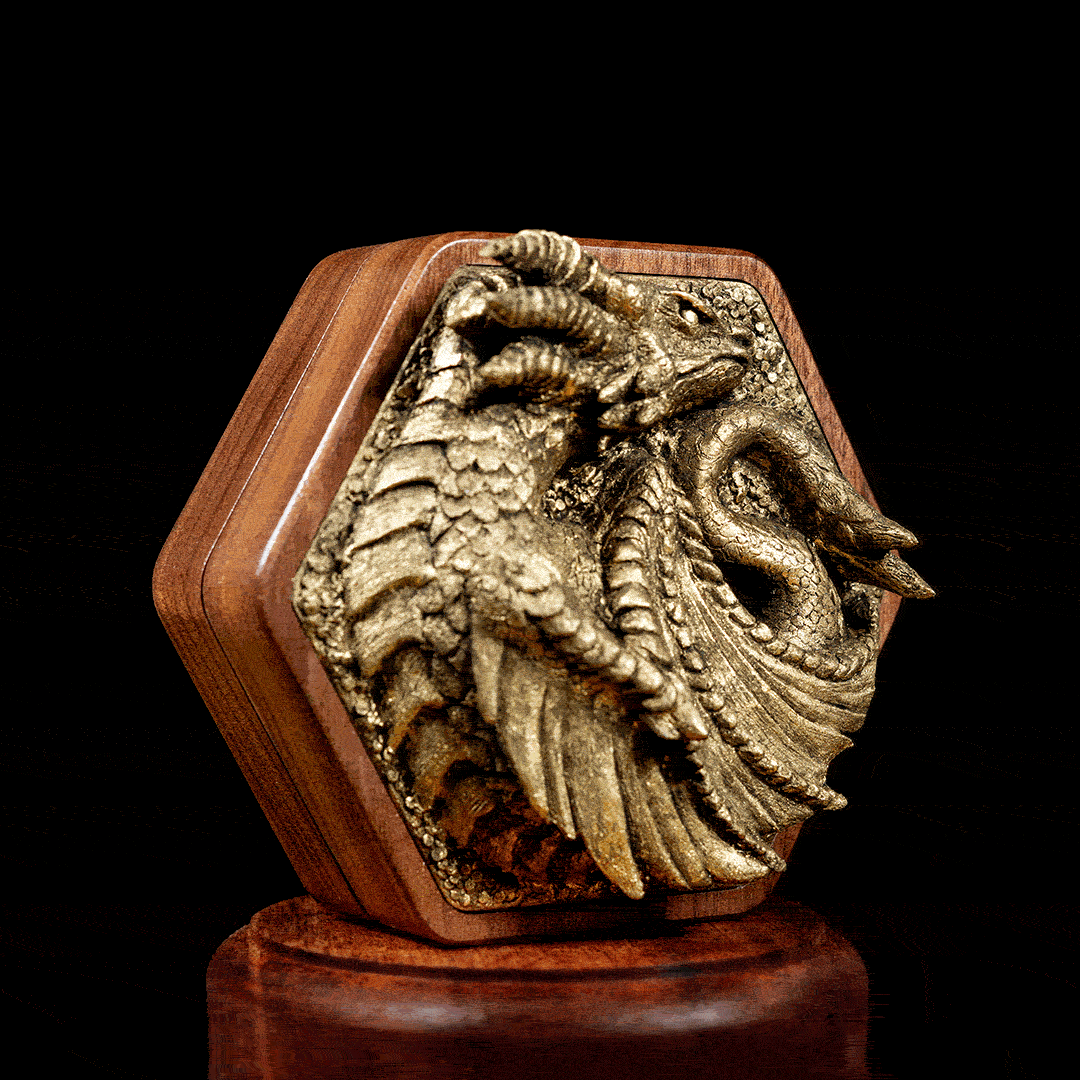 This hand-finished dice vault is made from a single piece of hardwood and topped with a resin sculpture dragon. The vault is secured with strong neodymium magnets, where your dice rest on felt liner and are snugly secured with foam infill. Comes in a high quality outer box to transport to game nights where it will elevate your play experience.